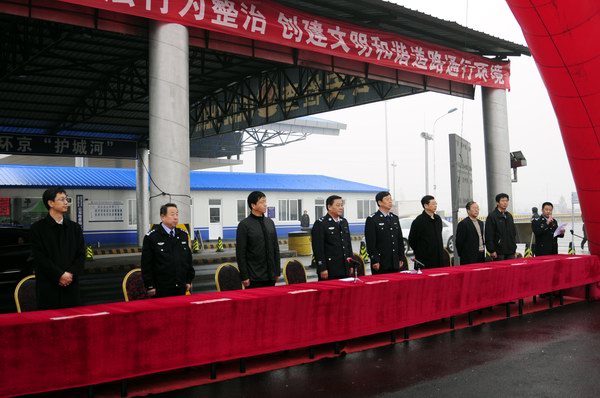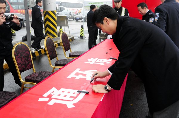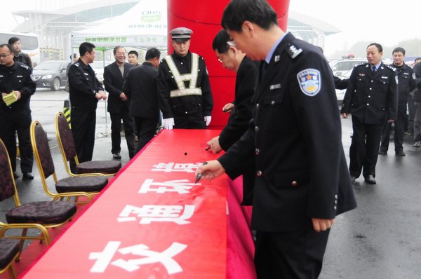 在專項行動啟動儀式上,與會領(lǐng)導同干警、群眾一起在橫幅上簽字,承諾通過嚴格執(zhí)法、嚴格監(jiān)管,切實改善道路通行秩序,保障交通安全暢通,最大限度地減少道路交通事故和降低人民群眾生命財產(chǎn)損失。(何文儒)