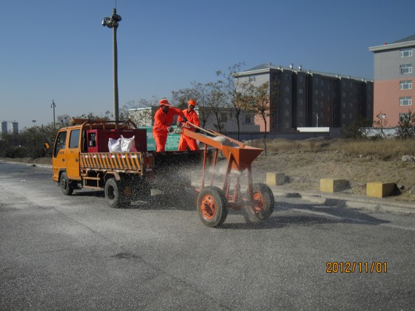 早上八點半,公司領(lǐng)導下令演練開始。在得到監(jiān)控中心雪情通知后,公司第一時間啟動除雪預案,稽查部根據(jù)命令及時在全線可變信息情報板發(fā)布除雪信息,提醒過往司機謹慎駕駛。所有參與除雪演練人員立即集合,各類除雪設備也跟隨到達現(xiàn)場。融雪液攪拌站立即開啟進行攪拌并馬上裝車,融雪液灑布車隨即開出進行噴灑。干撒作業(yè)組利用簡易干撒車裝滿干撒融雪劑進行人工散播,吹雪車按照要求在指定地點進行吹雪作業(yè),推雪鏟也立即進行裝鏟以備推雪。整個演練過程持續(xù)3個多小時,至中午十二點除雪演練圓滿結(jié)束。