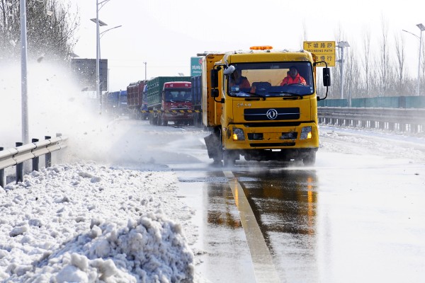 5日上午,公司接到上級電話通知和省廳轉(zhuǎn)發(fā)的北京市交通安全應(yīng)急指揮部《關(guān)于共同開展京藏高速公路搶通保暢工作的緊急函》,按照領(lǐng)導(dǎo)批示,公司投入全部養(yǎng)護人員,并動用協(xié)作單位力量,最大限度加大除雪力度,加快處置京張路段積雪,確保在八達嶺路段的擁堵車輛及時駛離北京,有效緩解了北京市的交通壓力。當晚,為防止路面結(jié)冰,公司又派出融雪劑噴灑車上路進行了補充作業(yè)。