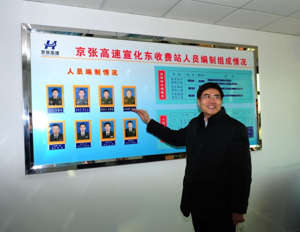 在宣化東收費(fèi)站,孫智勇一行查看了收費(fèi)站的榮譽(yù)室、票證室、結(jié)算室、宿舍、星級(jí)考核欄、站務(wù)公開(kāi)欄等,詳細(xì)了解收費(fèi)站的人員組成、收費(fèi)任務(wù)的完成情況、收費(fèi)流程、隊(duì)伍建設(shè)等情況。在結(jié)算室,孫智勇專門(mén)讓票證員拿來(lái)收費(fèi)結(jié)算的單據(jù),詳細(xì)了解收費(fèi)結(jié)算流程,并親切詢問(wèn)收費(fèi)員的家庭、生活、收入等情況,感謝他們?yōu)楣咀龀龅呢暙I(xiàn)。在認(rèn)真了解公司對(duì)收費(fèi)人員實(shí)行的星級(jí)考核內(nèi)容后,他給予了充分的肯定和贊許,認(rèn)為這種考核辦法既考慮了行業(yè)特點(diǎn)又結(jié)合了現(xiàn)代企業(yè)的要求,對(duì)于調(diào)動(dòng)員工的工作積極性、提高企業(yè)的效益有極大的促進(jìn)作用。