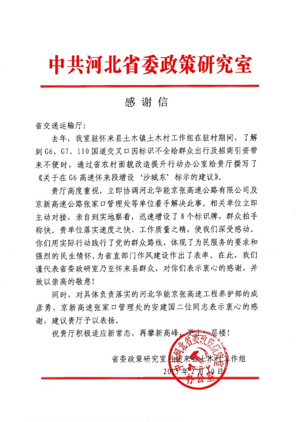2月中旬,省委政策研究室駐懷來土木村工作組向省交通運輸廳發(fā)出感謝信,代表省委政策研究室和當地群眾,對京張高速公司踐行群眾路線,積極落實道路標牌整治建議表示感謝并致以崇高的敬意。