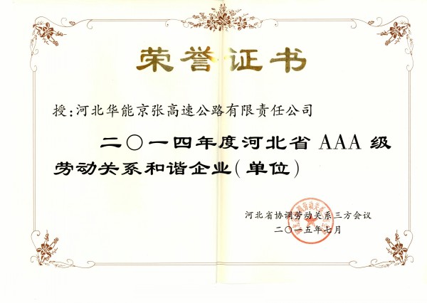 近日,公司在河北省人力資源和社會保障廳、省總工會、省企業(yè)家協(xié)會、省工商業(yè)聯(lián)合會聯(lián)合組織開展的“河北省AAA級勞動關(guān)系和諧企業(yè)(單位)”創(chuàng)建活動中,被命名為“二○一四年度河北省AAA級勞動關(guān)系和諧企業(yè)(單位)”稱號,這是河北省最高級別的勞動關(guān)系和諧企業(yè)榮譽(yù)。