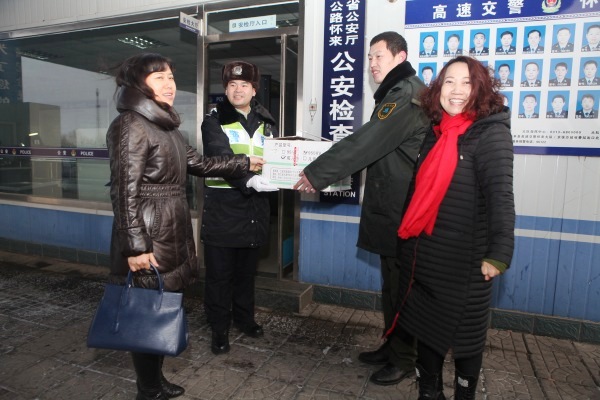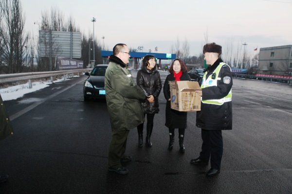 在京張高速公路冀京界懷來和宣化東公安檢查站,張慧敏一行與正在一線執(zhí)勤的交警一一握手慰問,對辛勤工作的交警表示誠摯的問候?倳嫀煆埢勖粽f,在這種能見度低、污染嚴(yán)重的霧霾和降雪的惡劣天氣條件下,交警同志不惜犧牲自己的健康,用堅守和執(zhí)著保障過往司乘人員的出行安全和道路暢通,用辛勤汗水和艱苦付出維護(hù)了京張高速公路的道路交通秩序,交警同志們辛苦了。長期以來,京張公司與高速交警懷來、宣化大隊保持友好關(guān)系并結(jié)下深厚友誼。為此向辛苦工作在一線的交警同志送來問候,對一線交警恪盡職守、無私奉獻(xiàn)的精神表示由衷的敬意。