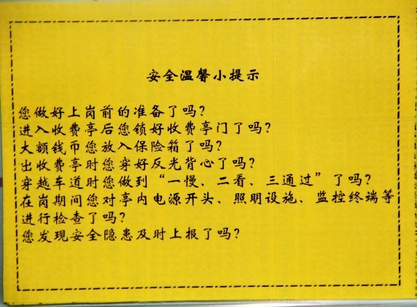 該站首先召開了專題會,精心組織,周密安排,營造濃厚的“安全生產月”活動氛圍;其次是形式多樣,務求實效。利用安全知識、安全提示卡、安全知識小測試等形式,普及安全生產常識。三是做好安全生產隱患自查自改工作。站安全領導小組集中對站內的收費、鍋爐、機電設施等重點區(qū)域進行了安全排查,針對發(fā)現的問題進行了整改。四是深化班組長在崗期間安全生產負責制。強化班組安全檢查制,每天由班組負責上崗期間收費亭、收費廣場的安全檢查,填寫《崗上安全巡查記錄》,做到了安全工作與業(yè)務工作的有效結合。(宣化東收費站 王輝)
