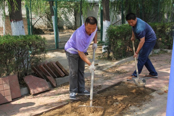 6月15日,郭強、段建平等幾名老同志主動到職工菜地勞動,為菜地除草、澆水。當發(fā)現菜地一角堆積了一些廢舊磚塊時,幾名老大哥一商量,干脆廢物利用,用這些磚塊為職工鋪一條采摘小路,大家紛紛表示贊同并積極加入勞動隊伍。小路修好后,干勁高漲的人們又一鼓作氣對“鼓包”的方磚路面進行了修整。