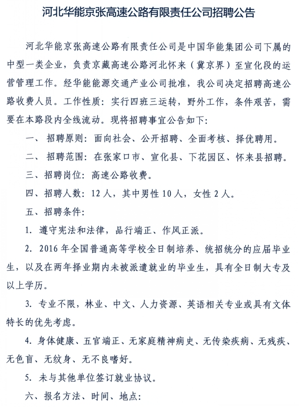 京張高速公司2016年收費(fèi)人員招聘公告