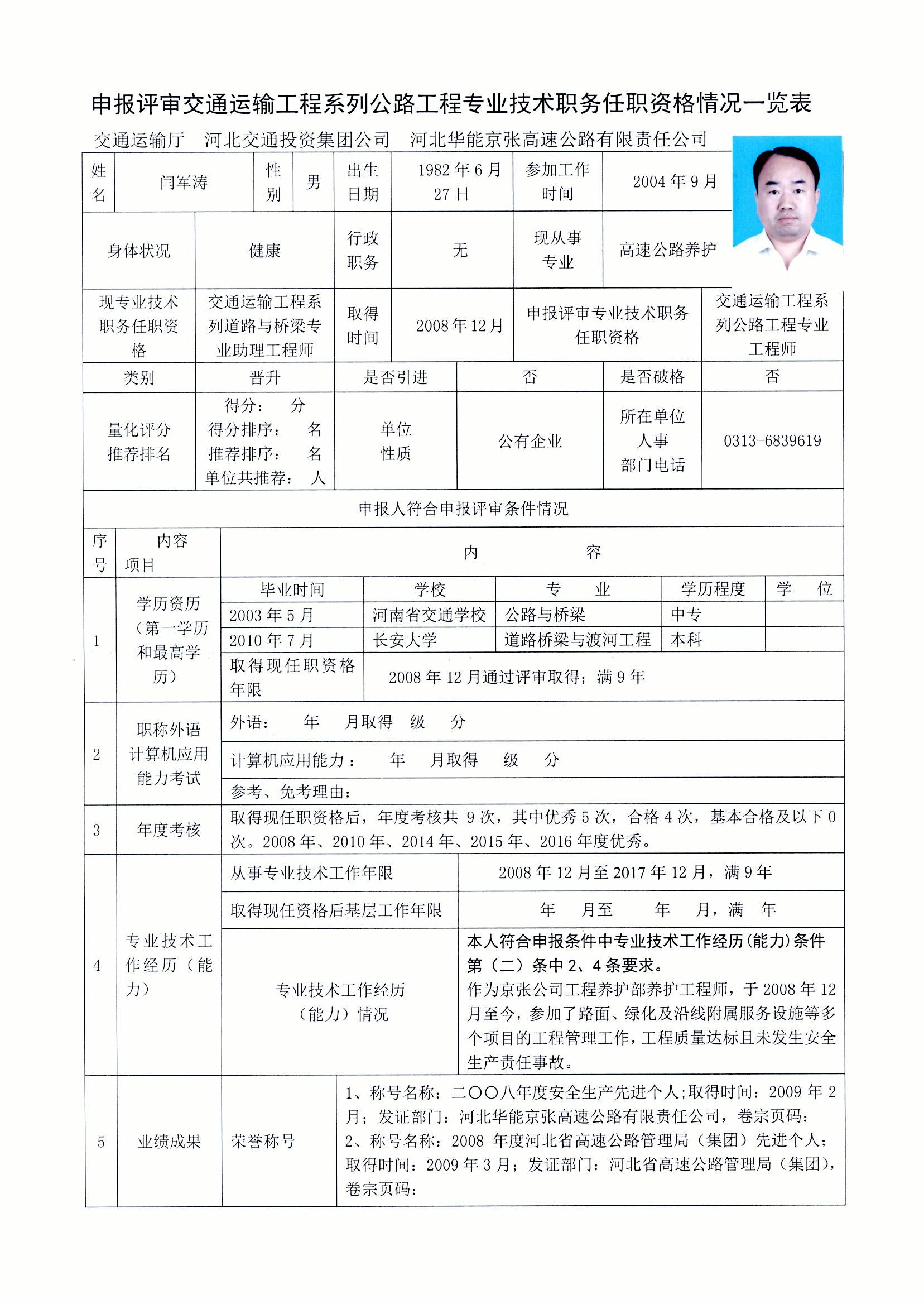 京張公司2017年度專業(yè)技術職稱申報公示(閆軍濤)