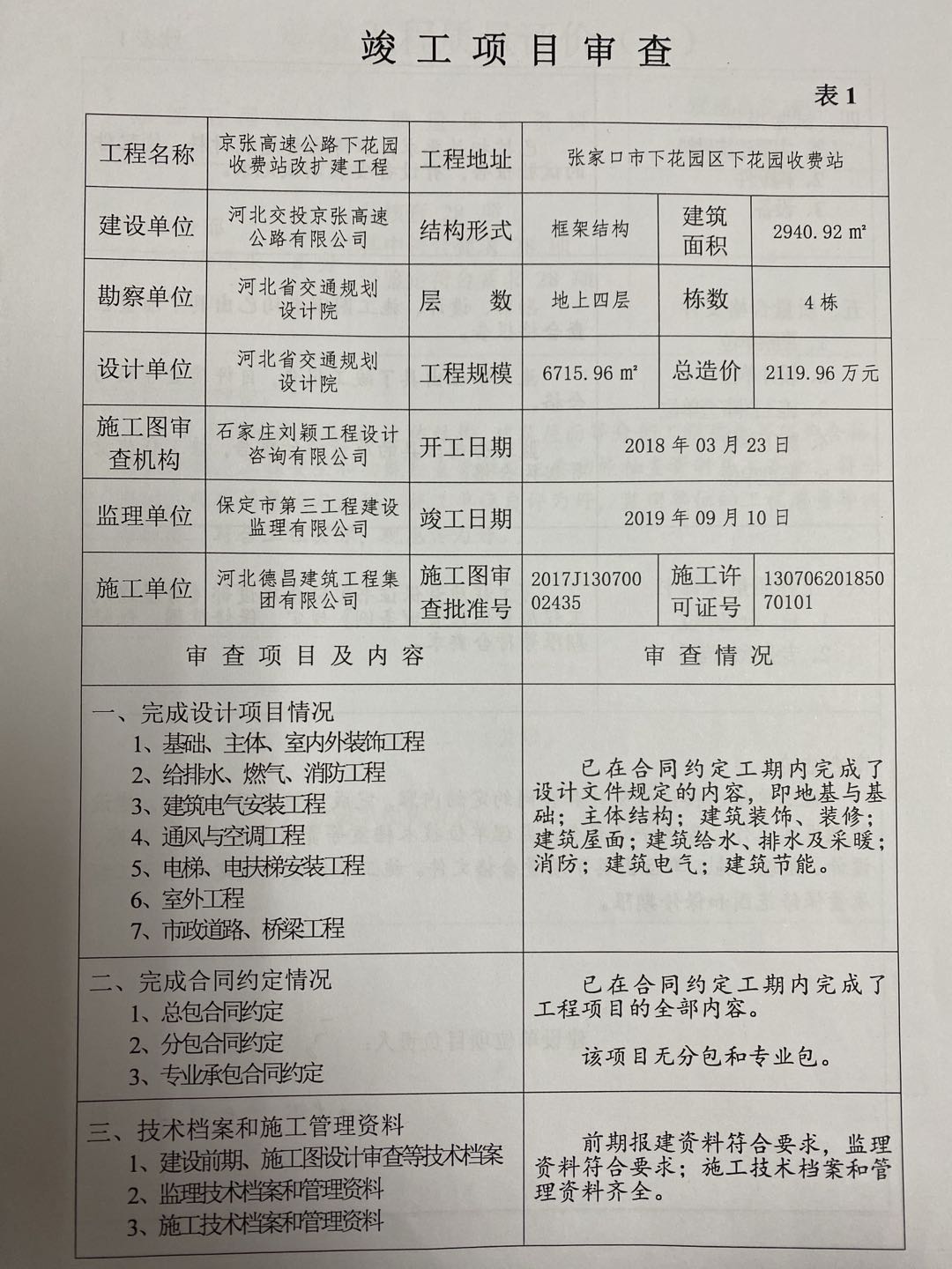 京張高速公路下花園收費(fèi)站改擴(kuò)建工程竣工驗(yàn)收報告